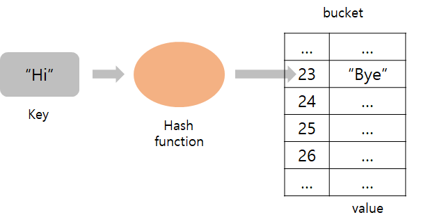 "Hi" 라는 데이터를 동일한 해시 함수에 넣으면 항상 23이라는 데이터를 반환한다. 사실 함수마다 다르지만 원래는 해시 함수의 반환값을 bucket size로 나눈 나머지(mod) 값을 인덱스로 사용하는 방법도 있다. 그러면 무조건 [0, bucket size) 범위의 인덱스가 나오니까. 어쨌든 이는 key를 통해 value가 저장된 인덱스에 상수 시간에 접근할 수 있다는 걸 뜻한다. 즉 O(1)의 시간복잡도를 가진다는 말이다. key-value 쌍이 10개든 100개든 1000개든 해시 함수 한번에 value의 index를 얻을 수 있기 때문이다. 물론 사용하는 해시 함수의 시간 복잡도가 key-value 쌍의 개수에 영향을 받아선 안될 것이다.(그럴 일이 있나 싶겠지만) 해시 함수가 아닌 key를 직접 비교해가며 value를 찾는다면 위 그림에선 24번 비교해야 23번 인덱스의 값에 접근할 수 있을 것이다.