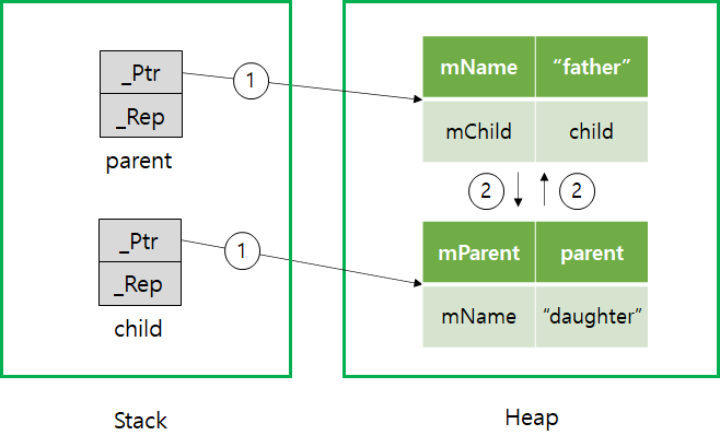아래 그림에서 집중해서 봐야할 것은 Heap 영역의 두 메모리 블럭(인스턴스)이다. 두 블럭은 make_shared를 통해 만들어진 각 클래스의 인스턴스이다. main(Stack)의 지역 변수인 parent와 child가 두 블럭을 각각 가리키기 때문에 참조 카운트가 각각 1이다. 그리고 Set 함수를 통해 mChild는 아래 블럭을, mParent는 위 블럭을 참조하도록 했다. 때문에 각 블럭에 대한 참조 카운트는 1씩 증가하여 2가 된다.