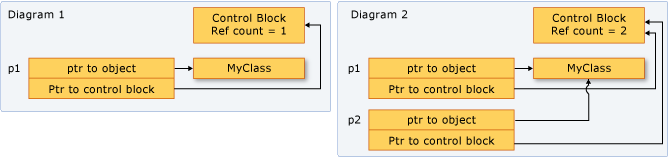 아래 그림을 보면 Diagram 1에서 p1이 MyClass와 참조 카운트에 관한 컨트롤 블럭을 가리킨다. 만약 Diagram 2처럼 MyClass를 참조하는 대상이 증가하면(p2), p1과 동일한 MyClass를 가리키며 참조 카운트 또한 증가된다. 그리고 참조 카운트 컨트롤 블럭 또한 따로 복사되어 저장되는 것이 아닌 동일한 주소를 가리킴으로써 공유한다.