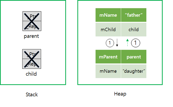 Parent 인스턴스(위)의 mChild는 여전히 강한 참조로 Child 인스턴스를 가리키고 있고, Child 인스턴스(아래)의 mParent는 약한 참조로 Parent 인스턴스를 가리키고 있다. 현재 두 인스턴스에 대한 참조 카운트는 다음과 같다.