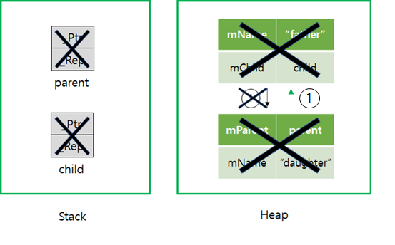Parent 인스턴스는 여전히 weak_ptr로부터 참조되고 있지만 strong ref가 0이므로 상관없이 자동으로 소멸된다. Parent 인스턴스가 소멸되면서 Parent의 멤버로 있던 mChild라는 공유 포인터도 함께 소멸된다. 결국 Child 인스턴스는 strong ref가 1 감소하여 0이 되고 더 이상 참조되지 않는다고 판단하여 소멸된다. 일종의 연쇄작용이라 볼 수 있다. 이렇게 순환 참조 문제가 해결된다.