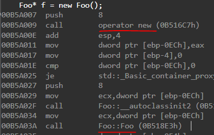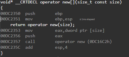 아래 코드를 보면 new 연산자를 호출하기 전에 스택에 8과 12를 push 해준다. 각 값은 sizeof(자료형) * 배열의 크기이다. ('0Ch'는 12를 16진수로 나타낸 값이다.)