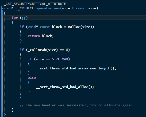 new 연산자는 new와 new[]로 나뉘는데, 전자는 원하는 자료형에 대한 초기값을 인자로 받고, 후자는 배열의 크기를 인자로 받는다. new 연산자는 실제로 다음과 같이 구현되어 있으며 내부적으로 malloc을 사용한다. 이런 말을 들어봤을지 모르겠지만, C++에서 사용되는 것 중 C에서 없던 기능이라면 내부적으로 C를 통해 구현되어 있을 확률이 높다.