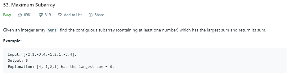 integer 배열이 nums로 주어지는데, nums의 연속적인 부분 배열의 합 중 최댓값을 찾아 반환해주는 함수를 작성하는 문제이다.