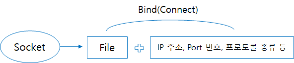 다음과 같이 소켓은 커널 모드에 접근하기 위한 파일과 네트워크 연결에 필요한 포트 번호, IP 주소 및 TCP/UDP와 같은 프로토콜의 종류 등을 묶어(binding) 하나의 소켓으로 표현한다. 이러한 작업을 서버 측에선 bind라고 표시하며 클라이언트 측에선 connect로 표시한다.