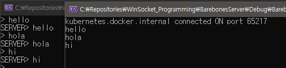 : 서버와 연결된 후 클라이언트 측에서 메세지를 보내면 서버측에서 받고 출력한다. 그리고 다시 메세지를 클라이언트에게 보내면, 클라이언트 측에서 받고 서버에서 온 메세지로 표시(SERVER>)하여 출력한다.