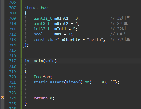 실제로 확인해보면 다음과 같이 assert에 걸리지 않으며, 1바이트 메모리에 3바이트의 쓰레기 값이 붙은 것을 볼 수 있다. 이는 컴파일러가 추가해준 값이다.