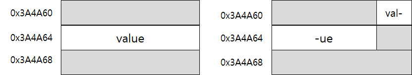 왼쪽은 0x3A4A64라는 주소의 메모리 블럭에 4바이트 값이 정렬되어 저장되어 있다. (끝 주소가 4의 배수)