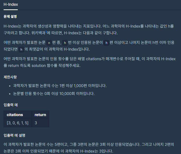 함수의 인자로 논문의 인용 횟수가 담긴 배열이 주어지는데, 여기서 H-index를 구해 반환하는 것이 문제이다. H-Index란 주어진 논문들 중 인용 횟수가 h번 이상인 논문이 h개 이상 존재하고, 나머지 논문은 h번 이하 인용된 것 중 가장 큰 h 값을 말한다.