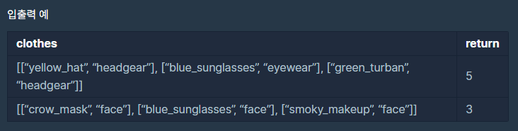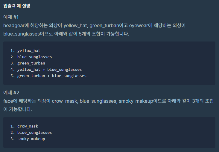 문제는 우선 간단하다. 얼굴, 상의와 같은 종류의 의상들이 주어지는데 그들 중 최소 1개 이상의 조합의 가지수를 구하는 것이다. 물론 같은 종류의 의상은 중복으로 착용할 수 없다. 예제를 살펴보면 첫 번째 예제의 경우 headgear 종류의 의상이 2개 eyewear에 해당하는 의상이 1개이므로 총 2개의 종류와 의상의 개수는 3개이다. 따라서 1개의 조합, 2개의 조합으로 입을 수 있으며 총 5가지의 수가 나온다.