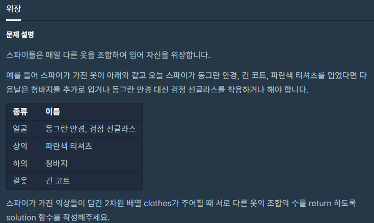 우선 해시맵을 이용하여 key-value 쌍을 (종류-의상들)로 저장한다. 예를 들면 "face" - ["crow_mask, "blue_sunglasses, ...]와 같은 식이다. 이렇게 분류한 뒤 종류 별로 조합하여 가능한 경우의 수를 모두 구하면 된다. 이 부분이 핵심인데, 기존에 내가 생각했던 방법은 너무 복잡하여 구글링을 해 보았다.