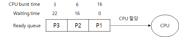 우선 P1은 첫 번째 프로세스이므로 대기하지 않고 바로 선택되어 실행된다. 따라서 P1은 0초의 대기 시간을 가진다. P2는 P1이 종료될 때까지 대기하므로 16초를 기다린다. P3는 P1과 P2 모두 종료될 때까지 기다려야 하므로 22(16+6)의 대기 시간을 가진다. 평균 프로세스의 대기 시간은 다음과 같다.