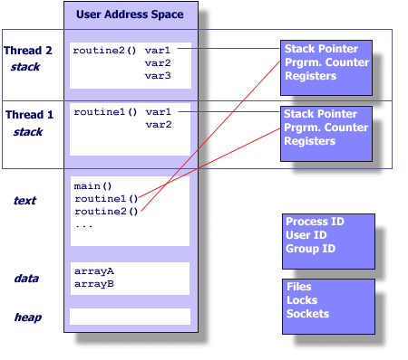 다음은 두 스레드가 code(text)와 data 영역을 공유하는 것을 표시한 그림이다. 스레드는 프로세스의 자원을 공유하지만, 하나의 영역(scope) 내에서 두 스레드가 각자 실행하는 곳이 다르므로 서로 다른 스택 포인터를 가지고 있다. 즉 스택 영역은 공유하지 않고 자신(스레드)만의 고유한 영역을 가진다는 의미다.