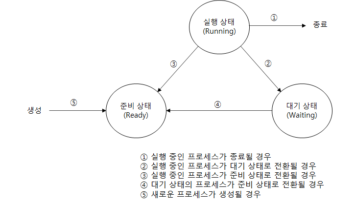 선점 방식은 3,4,5번의 경우에서 일어날 수 있는데, 3번의 경우는 CPU 할당 시간의 초과로 인해 하던 작업을 완전히 끝내지 못하고 준비 상태로 돌아가는 것이다. 4번은 입출력 및 인터럽트 처리 완료로 인해 대기 중이던 프로세스가 강제로 준비 상태로 돌아가는 경우이다. 5번은 새로운 프로세스가 생성되는 경우인데, 만약 새로운 프로세스가 현재 실행 중인 프로세스보다 우선 순위가 높을 경우 새 프로세스로 강제 교체되기 때문이다. 이외에도 사실 1번과 2번에서도 선점 방식의 스케줄링은 발생할 수 있다. 예를 들면 처리할 수 없는 에러로 인해 실행 상태의 프로세스를 강제로 종료하는 경우이다. 결과적으로 선점 방식은 이름 그대로 강제적으로 CPU 사용권을 빼았는 것이고, 비선점 방식은 자발적으로 CPU 할당을 내려놓는 경우이다.