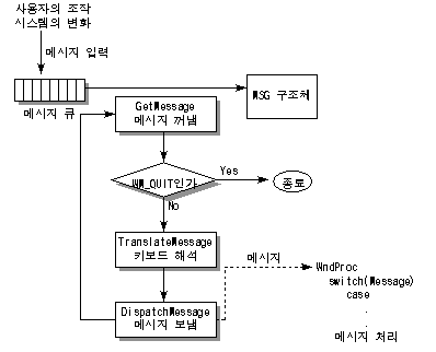 윈도우 프로그램은 다양한 작업 처리를 일종의 메세지(Message)를 통해서 처리하고 관리한다. 예를 들어 사용자의 키보드 입력 또는 마우스 변화와 같은 시스템 변화가 운영체제로 전달되면 운영체제는 이러한 것을 메세지로 만들어서 일종의 메세지 큐에 저장한다. 프로그램은 GetMessage(), PeekMessage()와 같은 함수를 통해 메세지 큐에서 하나의 메세지를 가져와서 처리한다. 보통 프로그램 내에 이러한 메세지를 반복적으로 가져오는 루프와 처리하는 함수를 구현한다. 메세지 루프는 보통 WM_QUIT라는 메세지를 받으면 종료한다. 우선은 윈도우 프로그램은 메세지 기반의 프로그램이라는 것과 동작 방식에 대해서만 기억해두자. 다음은 이러한 동작 방식을 나타낸 그림이다. (더 자세한 내용 클릭)