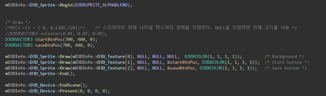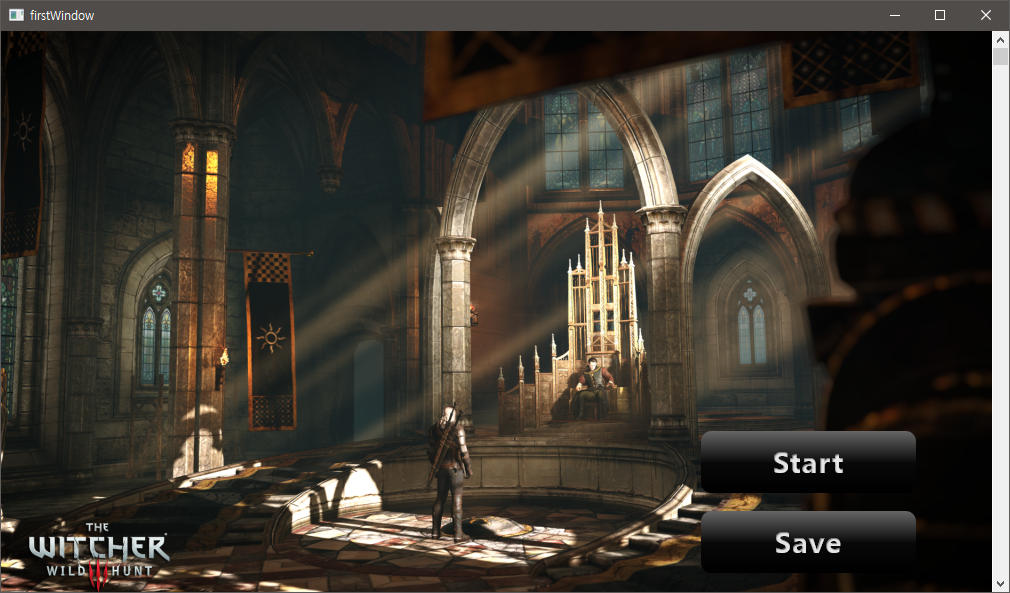위쳐 백그라운드 이미지는 인터넷에서 구하고 버튼은 파워 포인트로 만들었다. 2차원 객체를 그리도록 도와주는 스프라이트를 통해 그렸다. 코드는 별거 많은데 그냥 이미지 3개를 윈도우에 그린 것 뿐. 게임화면이라 하기도 민망한 정도. 완전한 게임을 만드는 그날까지..