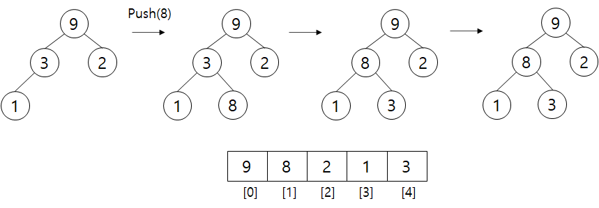(4) push(8). 현재 가장 큰 수: 9(top)