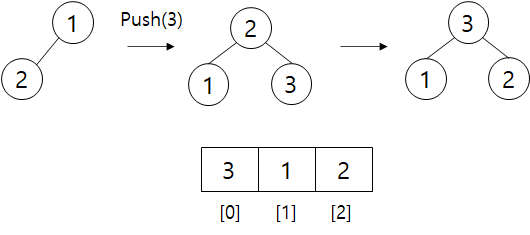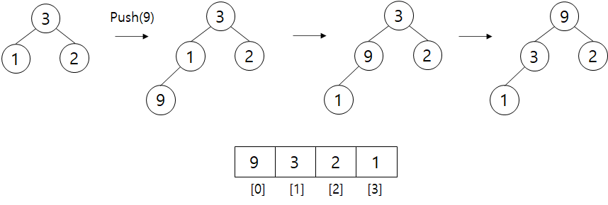 위 연산 순서가 힙처럼 동작함을 확인하기 위해 다음과 같이 그림으로 나타내 보았다. 힙의 삽입 및 삭제 연산의 과정과 실제로 각 노드의 값을 저장하고 있는 벡터(배열)의 모습이다. 그리고 위의 PrintElements() 함수를 통해 출력된 결과와 비교하여 실제로 동일한지 확인할 것이다.