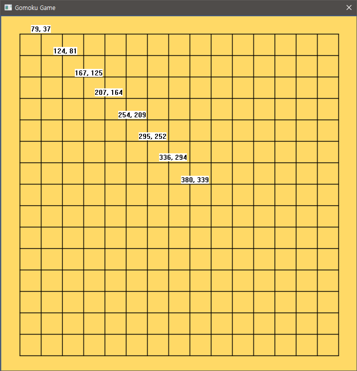 그리고 오목판과 오목알을 놓는 부분, 승리 조건과 관련된 부분은 가장 초기에 구현해 놓았다. 네트워크만 적용시키면 된다. 처음엔 어떻게 할지 감이 잘 안잡혀서 내 생각대로 구현했다. 오목판은 파워포인트로 만들고 이미지로 저장해서 GDI+로 출력했다. 그리고 깔끔함과 같은 곳에 여러번 두는 것을 방지하기 위해 아래처럼 오목판의 좌표를 조사해서 위 사진처럼 각 교차점에만 돌이 놓아지도록 했다. 그런데 정확히 교차점만 클릭하도록 하면 불편하니까 교차점으로부터 어느정도 거리 이내를 클릭하면 자동으로 교차점에 돌이 놓아지도록 했다.