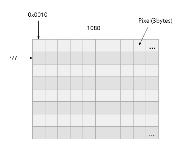 : 첫 번째 인자는 RECT* 타입을 받는다. 해당 표면의 RECT 영역만큼 잠금이 된다. 이 값이 NULL이면 표면 전체가 잠금이 된다. 일부 영역만 lock을 걸었을 경우 영역 밖의 access는 예기치 못한 결과를 발생시킬 수 있다. 두 번째 인자는 표면을 묘사하는 DDSURFACEDESC2* 타입의 값이다. Lock 함수 종료 시 표면 정보가 여기에 저장된다. 대표적인 정보들로는 해당 표면의 메모리 주소(lpSurface), 너비와 높이(dwWidth, dwHeight), pitch(lPitch) 정도가 있다. write을 위해 표면에 접근하고 싶을 땐 lpSurface를 이용하면 된다. 그리고 너비와 높이가 있다. 여기서 focusing할 대상은 width와 pitch이다. width는 단위가 pixel이다. width는 픽셀 당 비트 수(bpp)와 상관없이 항상 일정하다. 즉 width가 1080일 경우 8bit 표면이든 24bit 표면이든 width가 1080인건 변함이 없다. 만약 lpSurface가 0x0010이라 가정하자. width가 1080이고 한 픽셀은 3bytes(24bit)이다. 두 번째 행의 첫 주소에 접근하려면 lpSurface로부터 얼마를 이동해야 할까?