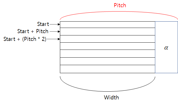 + 내용 추가) 항상 행의 끝과 다음 행의 시작이 이어지는 내용은 아닐 수 있다. 무슨 말이냐면 한 행의 마지막과 다음 행의 시작 사이에 어떤 추가적인 메모리가 끼어 있을 수 있다. 추가적인 메모리가 없을 경우 pitch는 width * 픽셀당 바이트 수가 되지만 추가적인 메모리가 끼어 있다면 width * 픽셀당 바이트 수 + α 가 된다. 어쨌든 Lock을 통해 얻은 pitch를 사용하면 문제가 없다는 것만 기억하자.