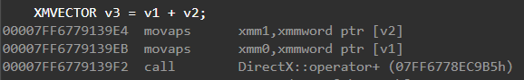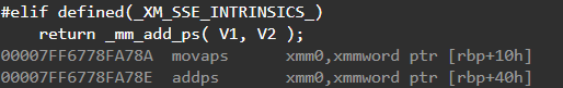하지만 __m128 타입을 사용하게 되면 sse 전용 명령어를 사용하게 되는 데 이 경우 다음과 같이 SSE 전용 레지스터인 xmm 레지스터에 값을 저장 후 연산을 진행하게 된다. 최종적으론 _mm_add_ps 함수 호출 시 addps라는 명령어로 실질적인 4번의 덧셈을 한번에 처리하게 된다.