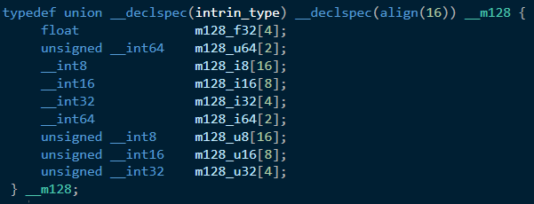 __m128 타입은 다음과 같이 union으로 정의되어 있는 것을 확인할 수 있다.