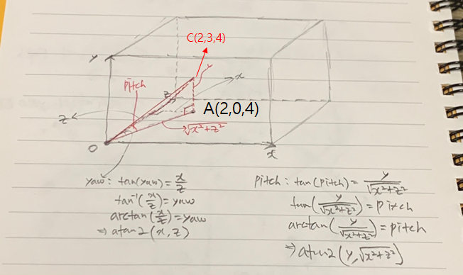 위 그림은 아까의 그림에서 이어진다. 이번엔 아까의 점 A에서 y축으로 3만큼 높아진 C(2,3,4)의 점을 생각해보자. 우리가 점 A를 바라보는 상태에서 고개를 들어 C를 바라보려고 한다. 그럼 그만큼 위로 회전한 각도가 생기는데 이 각을 pitch라 하자. 아까와 마찬가지로 원점 O와 A, C로 직각 삼각형을 만들 수 있다. 밑변은 OA가 되고 높이는 AC가 된다. pitch를 구하기 위해선 atan2에 밑변과 높이를 전달하면 된다. 높이는 y의 값이므로 3을 전달하면 된다. 밑변은 자세히 보면 사실 yaw를 계산했을 때의 삼각형의 빗변과 동일하다.