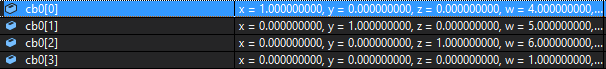 한편, cb0은 constant buffer를 의미하는데 여기에 world 행렬을 전달했으니 world 행렬을 의미한다. cb[i]는 i번 째 행을 의미한다. 따라서 위 코드는 행 벡터를 world 행렬의 각 행과 내적하는 것이다. 열이 아닌 행과의 내적이다. 다행히 우리는 셰이더로 보내기 전 전치를 취했으므로 첫 연산은 (1 0 0 4)와 내적하게 된다.