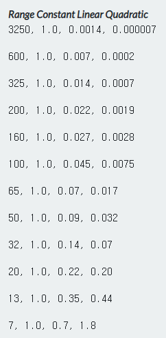 현실 세계에서 조명은 선형적으로 어두워지는 것이 아니라 곡선 형태로 감소한다고 한다. 이러한 자연스러운 감소를 위해 위의 방정식의 k1, k2 값들에 대해 테스트 된 데이터가 존재한다.