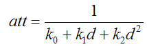 k0는 항상 1.0으로 고정인데, 이는 거리가 0일 경우 1로 맞춰 주기 위한 용도라 생각된다. k1과 k2는 모두 양수이다. d 또한 거리이므로 항상 양수이다. 따라서 위 결과는 0~1 사이의 값이 나올 것이고, 이를 Intensity처럼 조명의 결과에 곱해주면 된다.