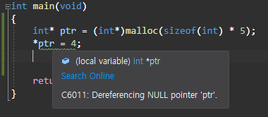 하지만 위 코드는 아래와 같이 C6011 경고를 발생시킨다.