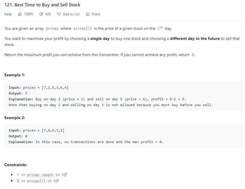 각 [i] day의 주식 가격이 담긴 int형 배열이 주어지고, 주식을 사고 팔아야 할 때 수익을 최대화하면 수익이 얼마인지 구하는 문제이다. 예를 들어 첫 번째 예에서 가격이 1일 때 사서 6일 때 팔면 수익이 5로 최대가 된다.