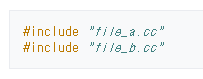 그래서 결국 유니티 빌드라는 건 동일한 헤더가 여러번 컴파일되는 현상을 피하는 기법이다. 인터넷을 찾아보면 아래와 같이 헤더가 아닌 소스 파일들을 include하는 것을 볼 수 있다. 아래의 두 소스 파일들은 동일한 헤더 파일을 include하고 있다고 가정한다.