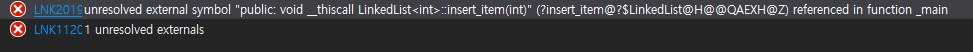 결론 먼저 말하면 클래스 템플릿은 헤더와 소스를 분리하면 안되고 그 선언과 구현(정의)을 같은 파일(.h)에 해야 한다.