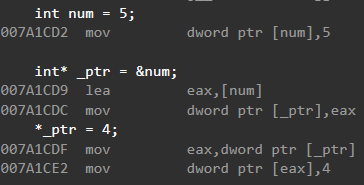 이 어떤 공간에 값을 복사하는 과정을 어셈블리어로 나타내면 mov eax, dword ptr [num] 이 됩니다.