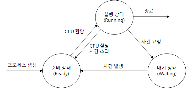 프로세스가 실행되는 도중 입출력처럼 CPU가 계속해서 일을 할 수 없는 사건을 요청받으면 프로세스는 대기 상태로 들어가게 된다. 그러다 입출력 처리가 완료되면, 다시 실행 상태로 가는 것이 아닌 준비 상태로 들어가 다시 CPU가 할당될 때 까지 기다린다.