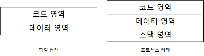 프로그램을 실행시키기 위해선 하드 디스크와 같은 보조 기억 장치에 있던 파일이 반드시 프로세스의 형태로 메모리에 적재되어 있어야 한다. 메모리에 적재되어 있는 프로세스의 구조는 파일로서 저장되어 있던 구조와 다르다. 파일은 코드 영역과 데이터 영역으로 구성되지만, 프로세스는 코드, 데이터, 스택 영역으로 구성된다.
