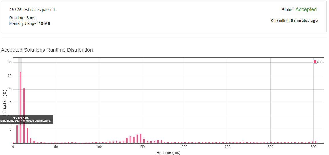 임시 변수 val에 target-nums[i]를 저장 후, 맵에 저장된 key 중 val이 존재한다면 nums[i]와의 합이 target이므로 정답을 찾은 것이다. 따라서 ret 벡터에 두 인덱스를 저장 후 반환한다. 찾지 못했을 경우 맵에 현재 요소와 인덱스를 저장한다.