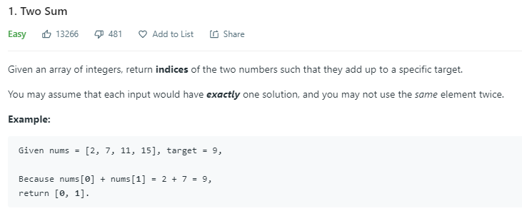 위의 예를 보면 2와 7을 더하면 target이 되므로 0과 1이 담긴 배열을 반환하면 정답이다.