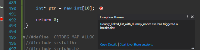 이 지점이 어디인지 알고 싶다면 _CrtSetBreakAlloc() 또는 _crtBreakAlloc 매크로를 통해 이 번호를 전달하여 찾을 수 있다.