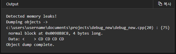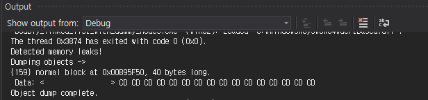 위와 같이 _CrtSetDbgFlag 또는 _CrtDumpMemoryLeaks() 함수를 통해 결과를 출력한다.