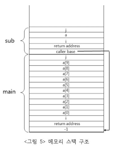 스택 포인터(SP)는 항상 스택 프레임의 top을 가리킨다. 그리고 베이스 포인터(BP)라는 것은 현재 실행되고 있는 함수의 스택 프레임의 첫 위치를 저장한다. 따라서 BP는 새로운 함수가 호출될 때마다 변경되므로 이전 BP를 어디엔가 임시로 저장시켜놓는다. 그 값이 위의 sub 스택 프레임에 저장된 "caller base"이며 main 함수의 첫 주소를 가리키고 있다.